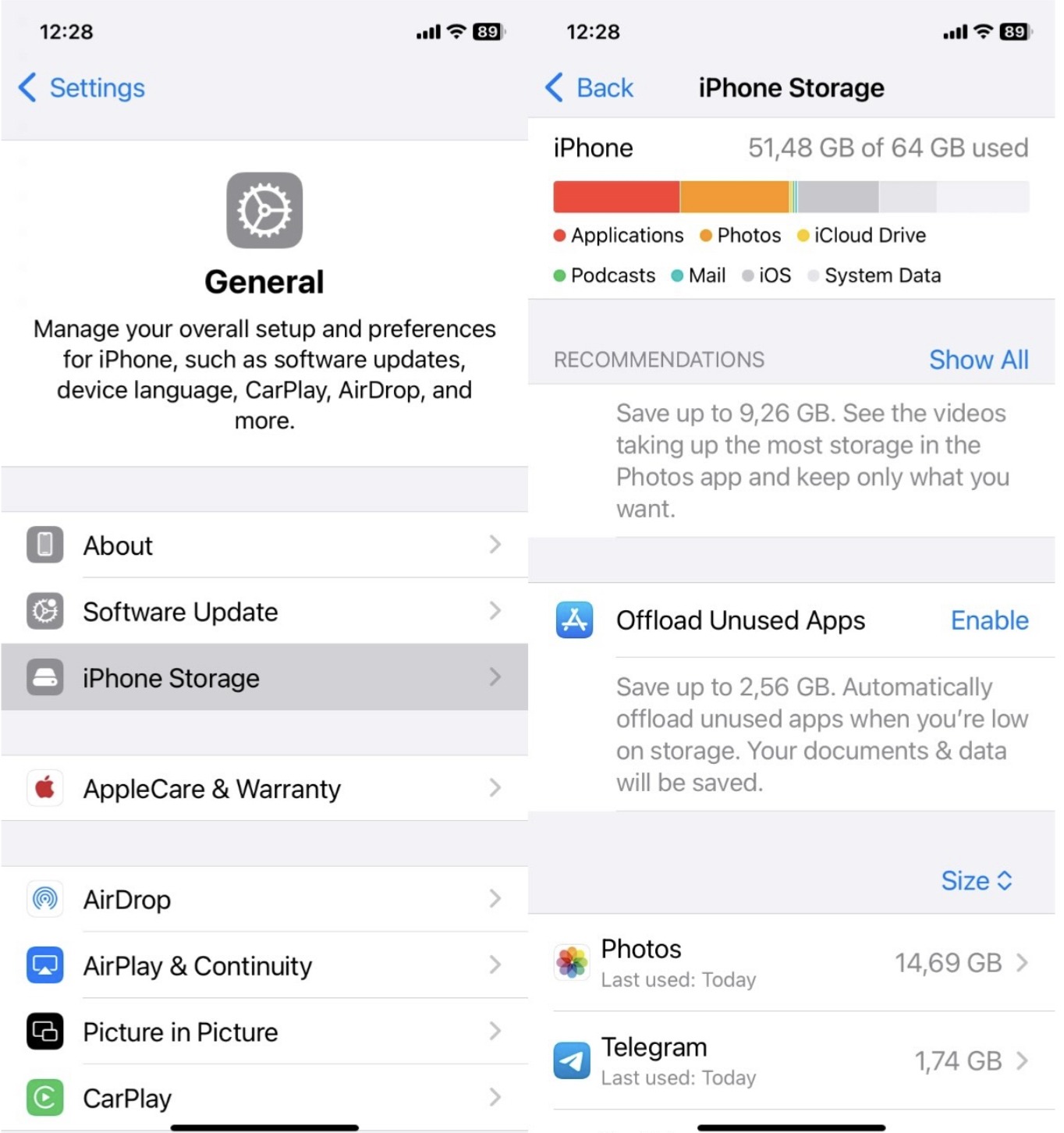 - Abra Configurações, Clique em Em geral e depois Armazenar iPhone.