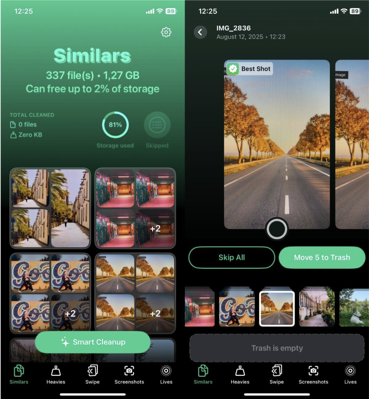 Para a maioria das pessoas, fotos e vídeos são o principal motivo da falta de espaço no iPhone, então é por aí que vamos começar. Não vamos dizer para você apagar as fotos antigas uma por uma — você já sabe disso. Em vez disso, recomendamos usar aplicações de limpeza iPhone para sua biblioteca de fotos. Eles são essenciais se você deseja obter resultados rápidos. Muitos deles podem remover automaticamente duplicatas (e imagens semelhantes, ao contrário álbuns duplicados no seu aplicativo Fotos), encontre fotos e vídeos grandes, exclua capturas de tela em massa e muito mais.